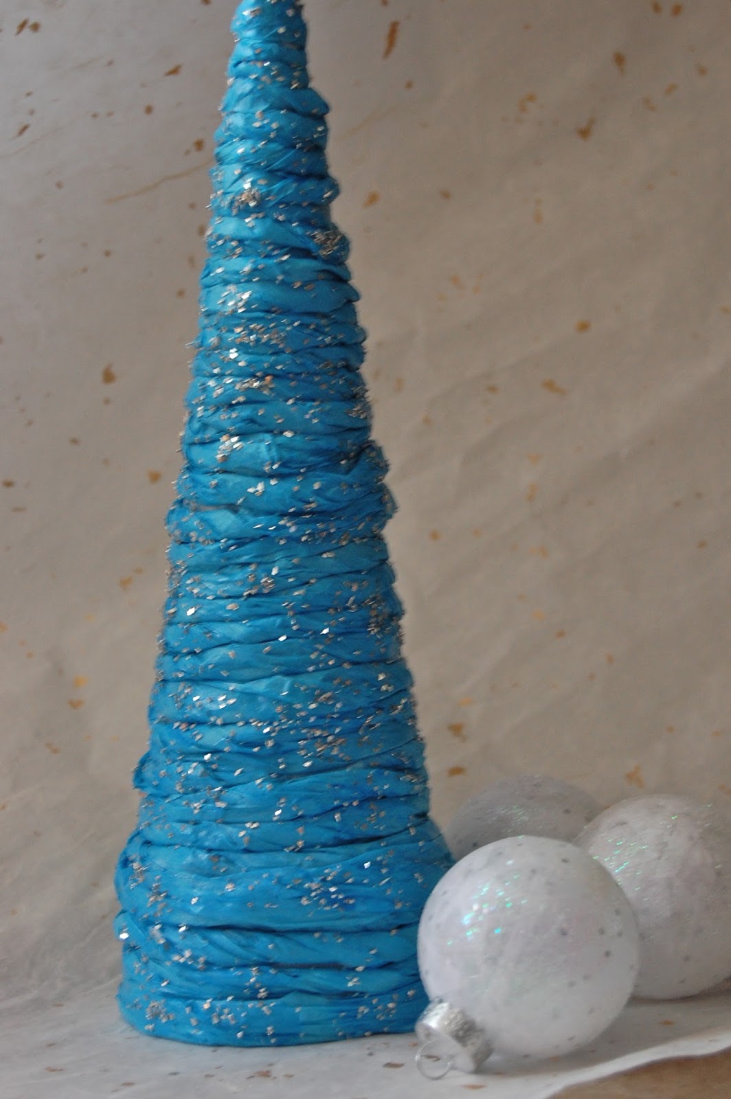 Begin a twist and tape the beginning to the cone starting at the bottom. Continue loosely or tightly twisting while wrapping around the cone. At the end of the twist tape to the cone or I have done this with hot glue. Your choice. Make sure the ends are hidden.