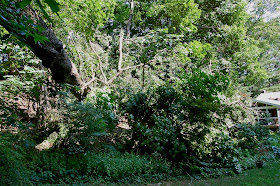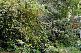 | See the large branch-that was the lowest branch. I don't even know how far into the yard the tree has gone, and it took other smaller trees with it. |