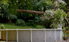 When we were house hunting many years ago, my priority was a private, tree filled yard. One where even though we lived in suburbia, I could feel like I was on vacation in the Adirondack Mountains. We found that yard, with many Oaks and Maples surrounding it, just perfect to me. But, the other night while I was reading in bed I heard a strange, loud crackling-a sound I have heard before. It lasted at least a minute. Suddenly, feeling like I was in slow motion, I began kicking off the covers to run to the other side of the house where my kids were in the living room. The reason being, there is a huge Oak next to our bedrooms! I called to my husband, and then ran out to see the tree. Nothing was there, but dust was floating around the garage spotlight, so I knew something had happened. As, I looked up to the back yard, there was a hole in the night sky-the biggest Oak in the yard was no longer there! I felt dizzy-what did it hit? Well, we are sooo lucky-the tree missed anything of value-the family,the dog, the house, the pool. This is actually the second tree to fall in our yard. The last one took part of the screened porch and patio. I love the big, old trees, but sometimes when I'm floating in the pool, looking up at the trees, I wonder if or when they will fall. We have had two others removed that were large also. I really don't want to cut any down if I don't have to. I'm gonna miss that old tree. But at least I don't have to worry about that one any more. Next step-the estimates and removal...eeek.