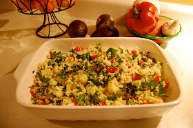 When cous cous is cooked, fluff with fork and refrigerate until cold. Once cold, add the following ingredients: